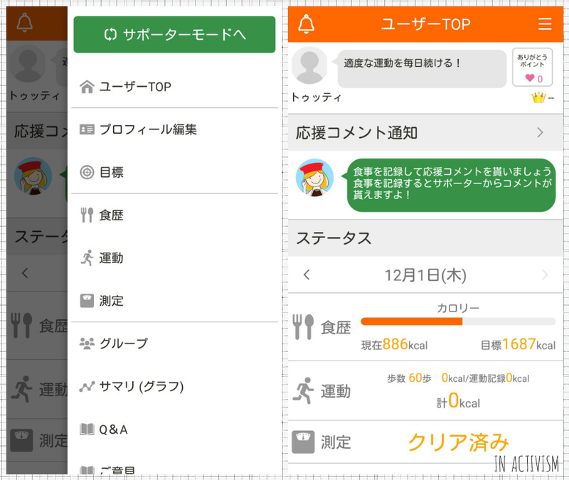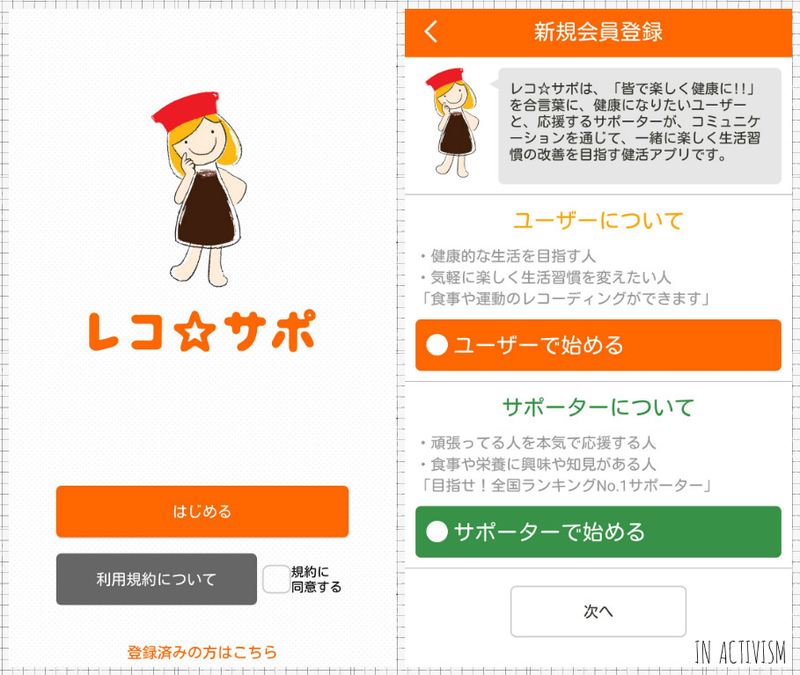 本アプリ、健康的な生活を目指す人や生活習慣を変えたい「ユーザー」と、頑張っている人を応援する「サポーター」のどちらかで始められます。